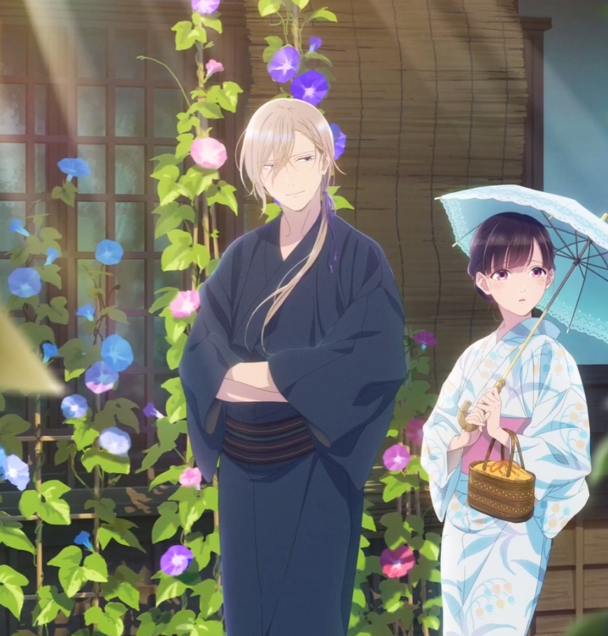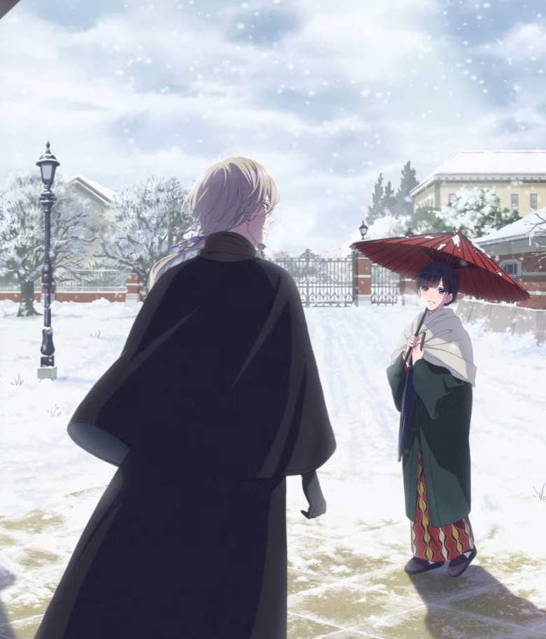 특히, 키네마 시트러스 스튜디오의 탁월한 작화는 이 작품의 감성적인 분위기를 완성합니다. 미요가 머무는 쿠도 가문의 저택은 고즈넉하면서도 우아하며, 빛과 그림자의 사용이 매우 섬세합니다. 미요의 옅은 색 기모노와 키요카의 군복이 대비를 이루며 각 캐릭터의 처지와 성격을 은유적으로 보여주는 것도 인상적입니다. 잔잔한 일상 장면에서의 섬세한 빛 처리와 캐릭터의 미묘한 감정 변화를 포착하는 클로즈업 연출은 이 작품의 몰입도를 높이는 주요 요인입니다. 보는 내내 한 폭의 수채화 같은 느낌을 받았으며, 특히 눈 내리는 밤, 두 사람이 함께하는 장면 등은 숨이 막힐 정도로 아름답습니다.