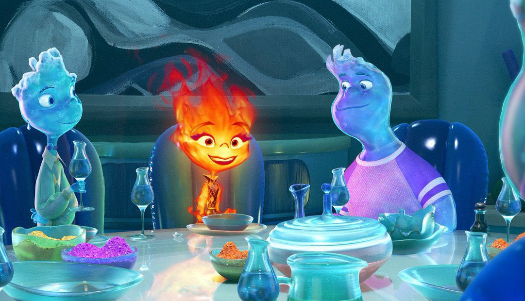 엘리멘트 시티의 배경 묘사 또한 놓칠 수 없는 관람 포인트입니다. 물을 중심으로 설계된 운하 도시, 공기 원소들이 구름을 타고 다니는 모습, 땅 원소들이 거대한 빌딩을 이루는 방식 등은 상상력의 한계를 뛰어넘습니다. 불 원소들이 사는 '파이어 타운'은 마치 뉴욕의 이민자 거리처럼 좁고 복잡하지만, 그들만의 문화와 따뜻한 정이 넘치는 공간으로 그려집니다. 특히, 한국계 감독의 영향으로 엿볼 수 있는 한국적인 디테일(예: 앰버의 아빠가 손님들에게 인사하는 방식, 파이어 타운의 간판 등)은 관객들에게 친근함과 재미를 더합니다. 이러한 시각적인 풍요로움은 단순히 눈을 즐겁게 하는 것을 넘어, 앰버와 웨이드의 감정 변화와 성장에 깊이 공명하게 만듭니다. 웨이드의 가족이 앰버에게 "숨 쉬어 봐"라고 말하며 앰버의 불꽃을 잠시나마 평온하게 만드는 장면은, 사랑하는 사람의 존재가 주는 정서적 안정감을 매우 섬세하게 표현한 연출입니다.
