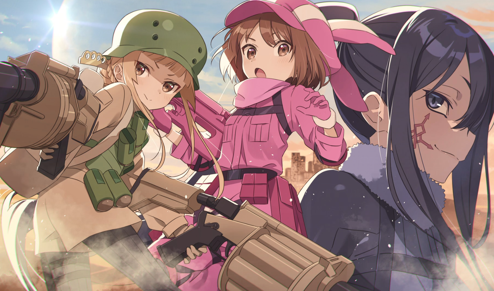 A-1 Pictures의 제작력이 빛을 발하는 GGO A 2기는 시각적인 즐거움 또한 빼놓을 수 없습니다. GGO의 세계는 황량하지만 디테일이 살아있는 폐허, 뜨거운 태양이 내리쬐는 사막, 그리고 어둠이 깔린 도시의 야경까지, 총격전의 스릴을 극대화하는 완벽한 배경을 제공합니다. 특히 총기류의 모델링과 발사 이펙트, 그리고 총알이 빗나갔을 때의 흙먼지 효과 등은 실제 밀리터리 마니아들도 인정할 만한 수준의 사실감을 자랑합니다. 총기의 '손맛'이 시각적으로 완벽하게 구현되어, 시청자들에게 높은 몰입감을 선사합니다.